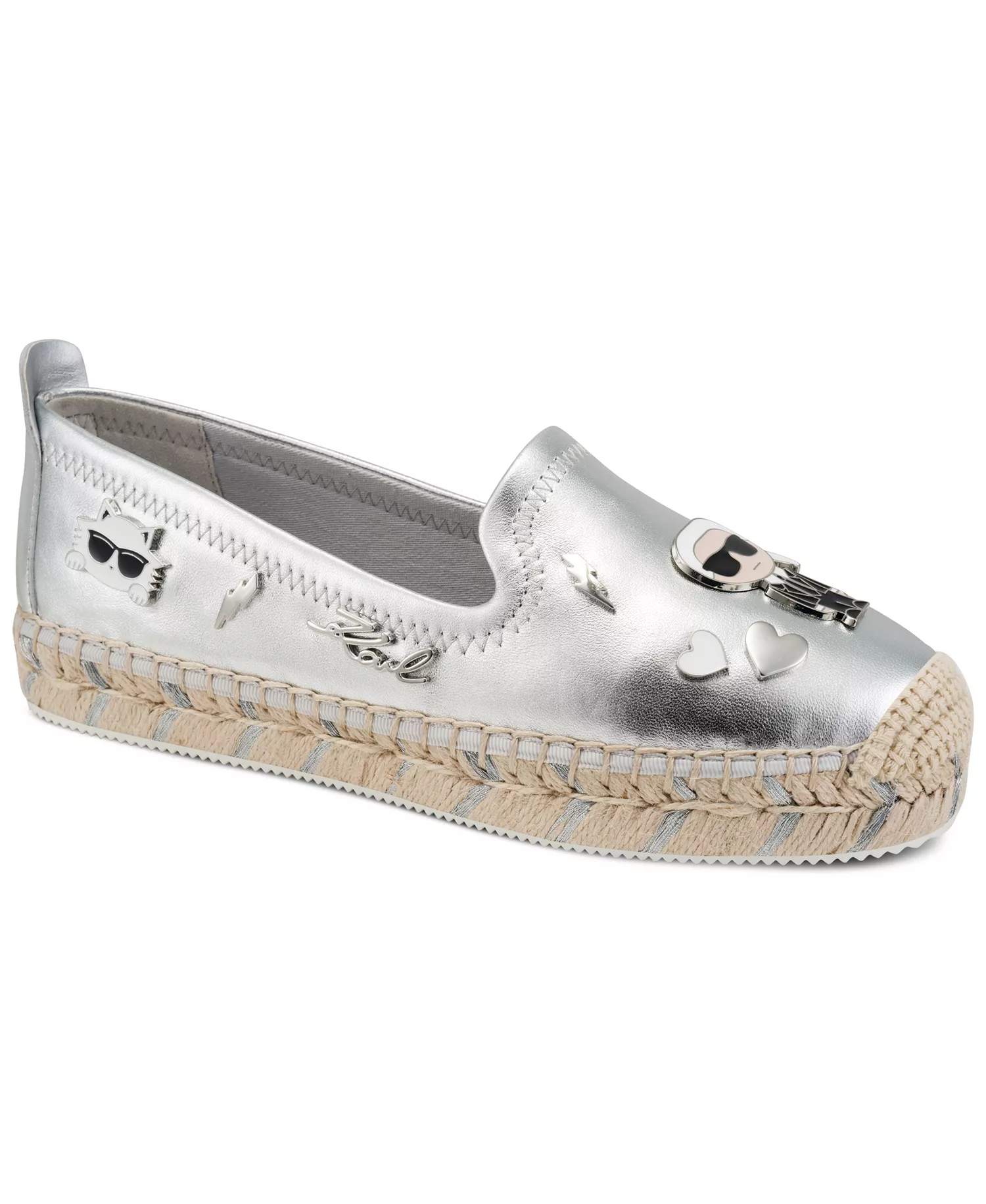 Подробности о продукте Туфли на плоской подошве Michaela от Karl Lagerfeld Paris в фирменном стиле с блестящими очаровательными деталями и эспадрильями на платформе создают ощущение свежести. Особенности продукта Тип каблука: плоская пятка. Застежка-липучка Форма носка: круглая. Верх: 80 % кожа, 20 % металл; материал подкладки: 97% хлопок, 3% спандекс; подошва: 100% резина Пятно чистое Импортировано